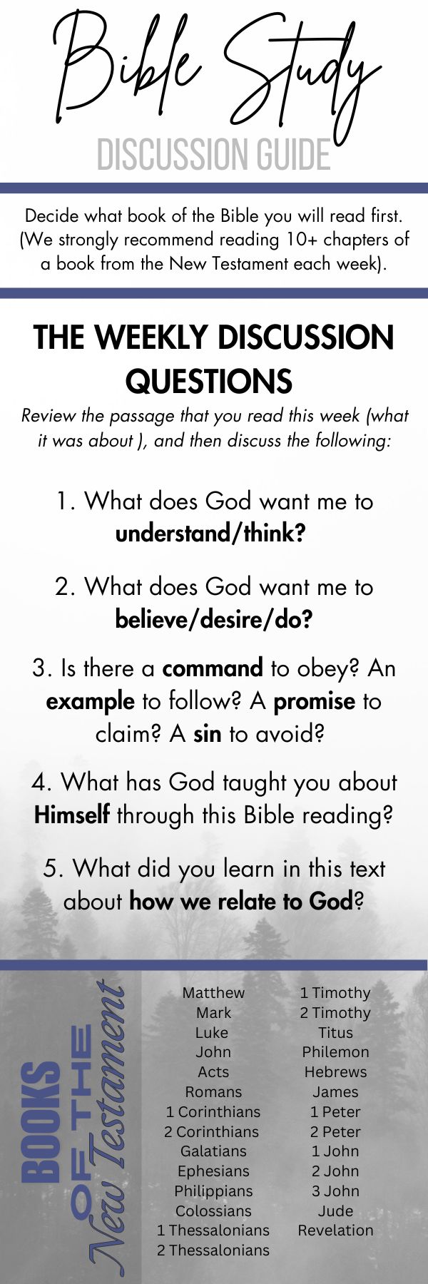 If you like reading with friends, you can use this bookmark to guide your discussions! Pick a NT book of the bible, read a chapter a day, and then meet weekly to discuss!